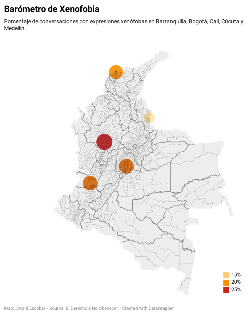 En la actualidad, los imaginarios sobre la población migrante venezolana en Colombia, continúan siendo un obstáculo para la integración social y cultural entre ciudadanos nacionales y extranjeros. De acuerdo con el Barómetro de Xenofobia de la plataforma El Derecho a No Obedecer, entre el 25 de julio y el 25 de agosto de 2020, se analizaron en Colombia un total de 46 mil mensajes emitidos por 19 mil autores en Twitter y en medios de comunicación. Entre otras conclusiones, este informe indica que “la cantidad de mensajes xenófobos está fuertemente correlacionada con la conversación que asocia migración y seguridad”. En específico, Medellín es la ciudad con el porcentaje más alto de mensajes xenófobos en este periodo.