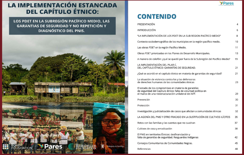 A cuatro años de la implementación del Acuerdo Final de Paz, PARES presenta un informe sobre la implementación de los Programas de Desarrollo con Enfoque Territorial (PDET) en la subregión Pacífico medio, sobre el estado actual de las garantías de seguridad para los grupos étnico-raciales en el país, y sobre la implementación del programa Programa Nacional Integral de Sustitución de Cultivos de Uso Ilícito (PNIS), a nivel nacional y en los territorios étnico-raciales.