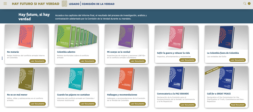 La Comisión de la Verdad publicó el 28 de junio, los tres primeros documentos que hacen parte de un todo llamado «Informe final de la Comisión para el esclarecimiento de la verdad, la convivencia y la no repetición«. Brevemente te contamos qué contiene y dónde acceder a ellos. También invitamos a todos los colombianos a conocer estos documentos, a explorar la transmedia y a difundir su contenido.