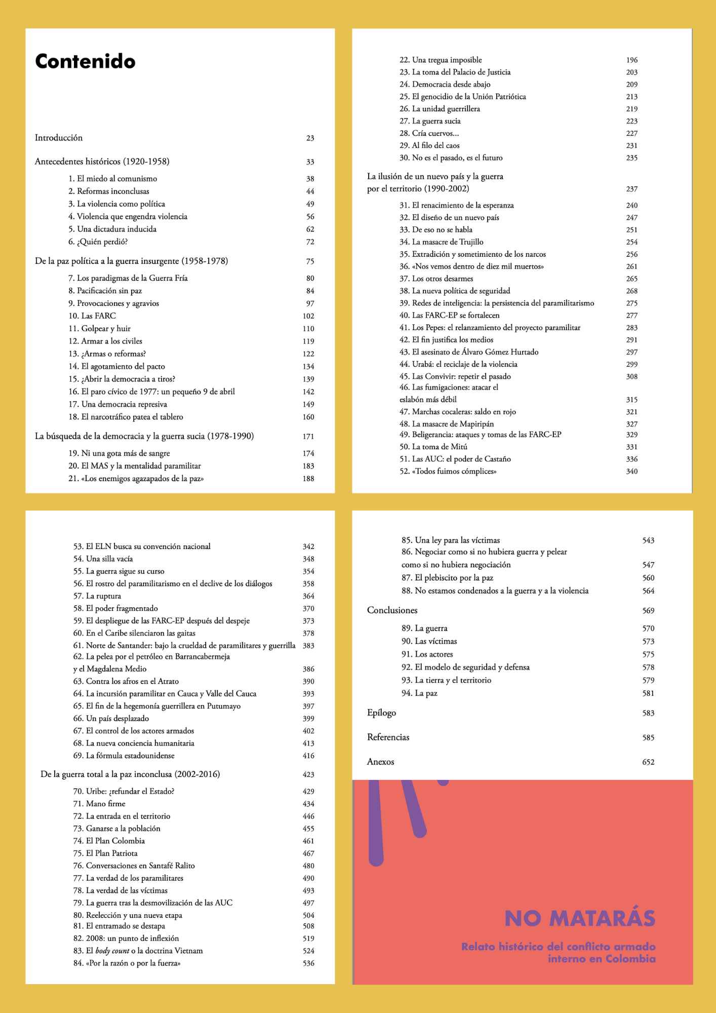 Este tomo del Informe Final de la Comisión de la Verdad, que se titula No matarás. El primer mandamiento de la democracia colombiana, parte de la premisa de que no estamos condenados a la guerra y a la violencia perpetua. Para Colombia, la suerte no está echada. Este relato no presenta una historia en la que todo es predecible o en la que existen leyes de las que no podemos escapar. Por el contrario, muestra idas y venidas, espacios opacos y momentos que pueden contradecir o reafirmar visionesclásicas sobre el conflicto colombiano. No tiene la pretensión de convertirse en una lectura única del conflicto armado interno. En cambio, busca aportar en dos vías: primero, resaltar la enorme complejidad que reviste la guerra colombiana. Aunque este relato se construyó con la idea de comprender cómo interactúa el conflicto armado con el poder y el régimen político, son varias las aristas, dimensiones y vetas que están aún por explorar y esclarecer.