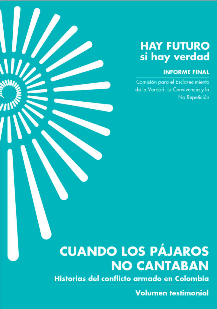 El interés por seguir explorando el Informe final de la Comisión de la Verdad, se afianzó y por ello pasamos a un nuevo volumen. El siguiente volumen que nos proponemos abordar se titula Cuando los pájaros no cantaban. Historias del conflicto armado en Colombia. Consta de una introducción –»¿Qué es una voz? (la reproducimos en esta web)»– y tres extensos y muy conmovedores capítulos: «El libro de las anticipaciones» (páginas 16 a 119), «El libro de las devastaciones de la vida» (páginas 120 a 368) y «El libro del porvenir» (páginas 369 a 497).